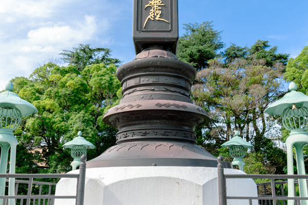 宝塔の台座には、仏教における十界のうち仏界を除いた世界が紋様で表されており、その最上部に仏界たる南無阿弥陀仏法華経の塔身が立っています。